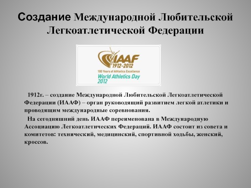 Слайд 14Создание Международной Любительской Легкоатлетической Федерации