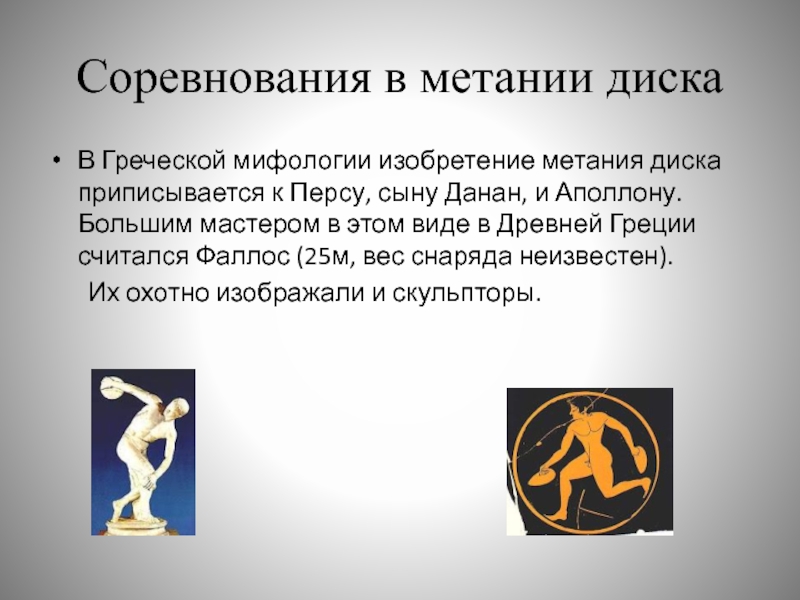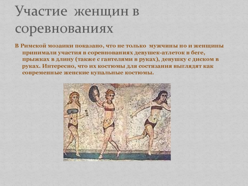 длину (также с гантелями в руках), девушку с диском в руках. Интересно, что их костюмы для состязания выглядят как современные женские купальные костюмы.
