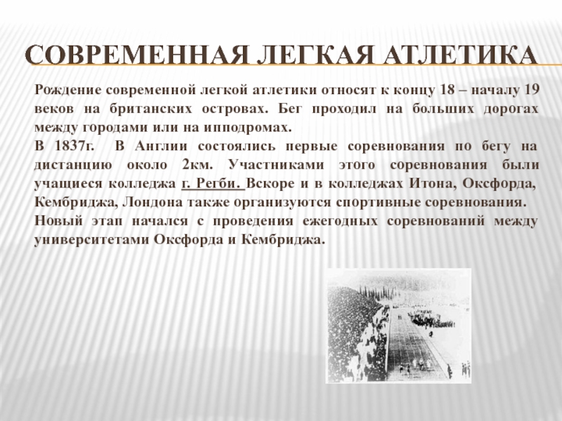 В 1837г. В Англии состоялись первые соревнования по бегу на дистанцию около 2км. Участниками этого соревнования были учащиеся колледжа г. Регби. Вскоре и в колледжах Итона, Оксфорда, Кембриджа, Лондона также организуются спортивные соревнования.