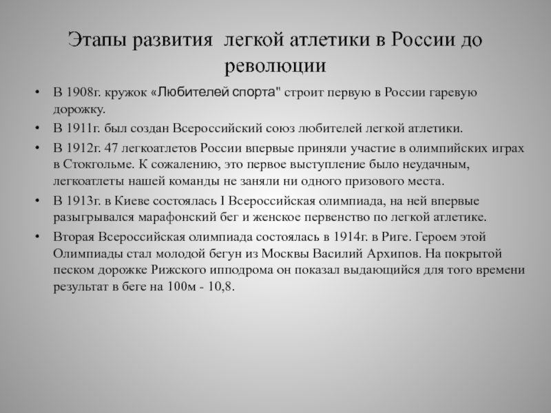 Слайд 16Этапы развития легкой атлетики в России до революции