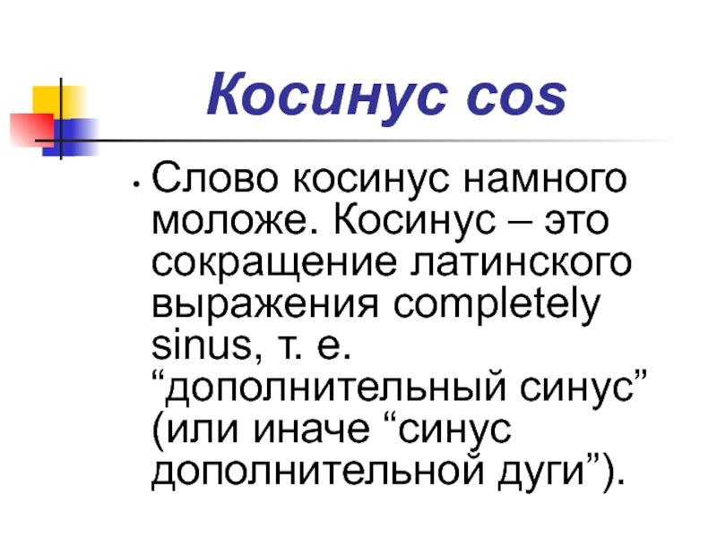 Слово косинус намного моложе. Косинус – это сокращение латинского