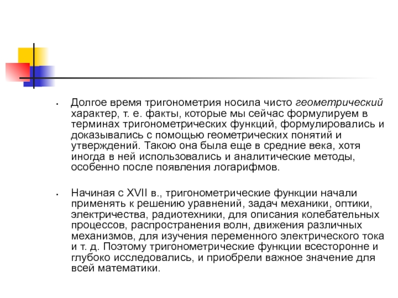 Слайд 5Долгое время тригонометрия носила чисто геометрический характер, т. е. факты,