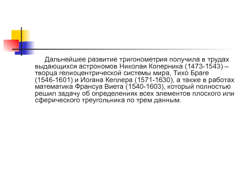 Слайд 16Дальнейшее развитие тригонометрия получила в трудах выдающихся астрономов Николая Коперника