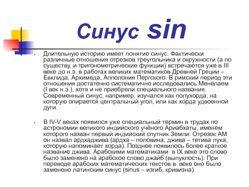 Длительную историю имеет понятие синус. Фактически различные отношения отрезков