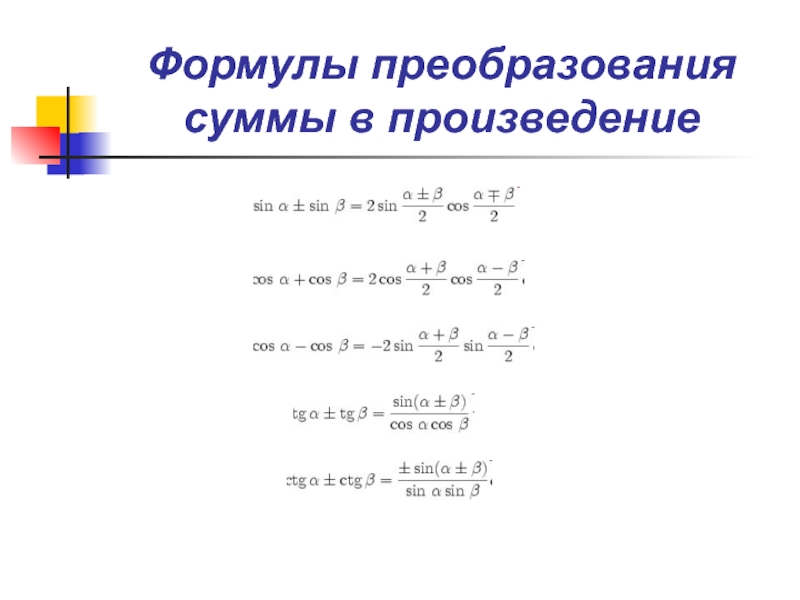 Слайд 22Формулы преобразования суммы в произведение