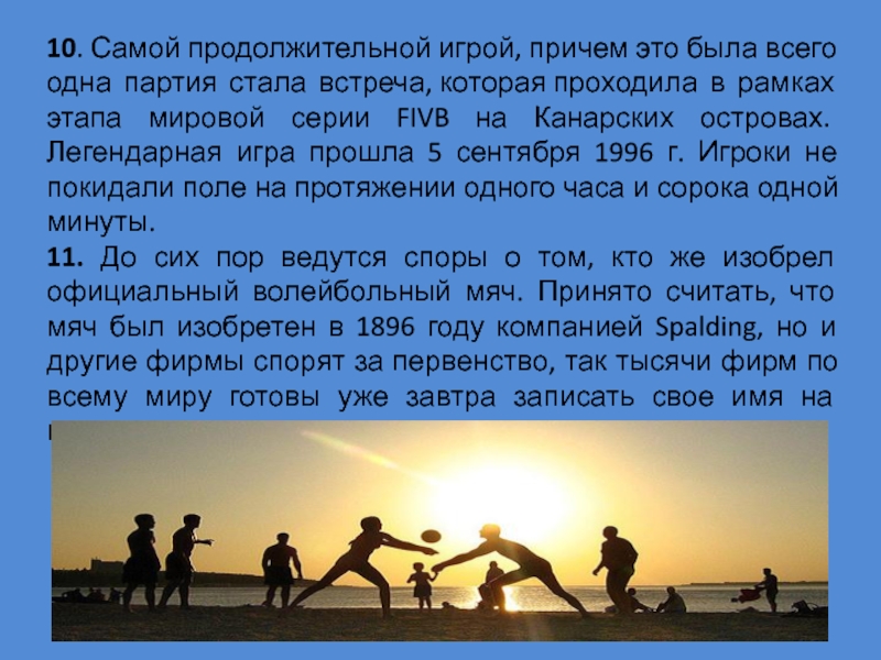 11. До сих пор ведутся споры о том, кто же изобрел официальный волейбольный мяч. Принято считать, что мяч был изобретен в 1896 году компанией Spalding, но и другие фирмы спорят за первенство, так тысячи фирм по всему миру готовы уже завтра записать свое имя на историю этого вида спорта.