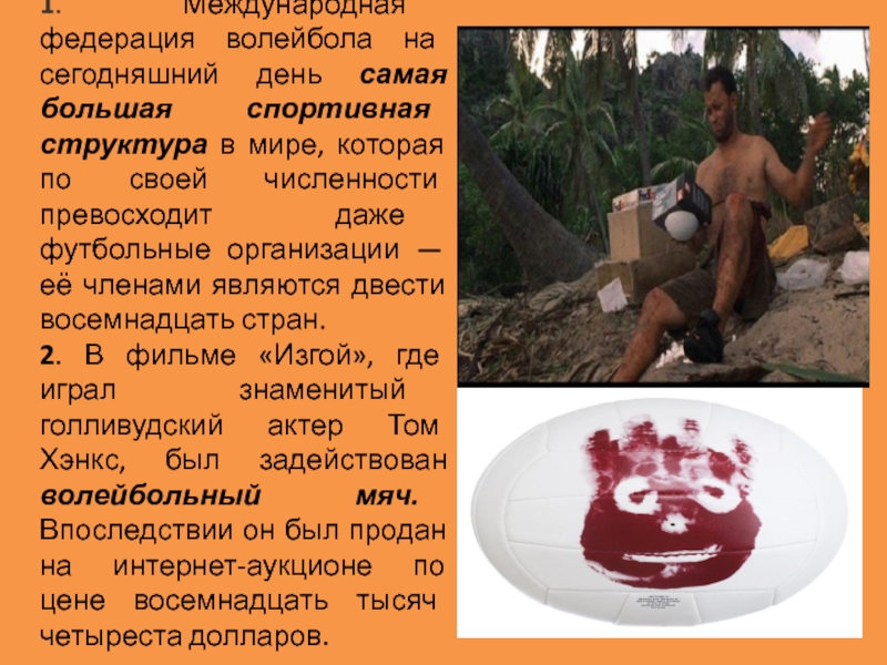 2. В фильме «Изгой», где играл знаменитый голливудский актер Том Хэнкс, был задействован волейбольный мяч. Впоследствии он был продан на интернет-аукционе по цене восемнадцать тысяч четыреста долларов.