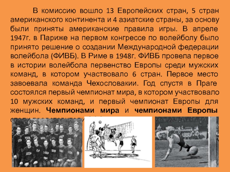 были приняты американские правила игры. В апреле 1947г. в Париже на первом конгрессе по волейболу было принято решение о создании Международной федерации волейбола (ФИВБ). В Риме в 1948г. ФИВБ провела первое в истории волейбола первенство Европы среди мужских команд, в котором участвовало 6 стран. Первое место завоевала команда Чехословакии. Год спустя в Праге состоялся первый чемпионат мира, в котором участвовало 10 мужских команд, и первый чемпионат Европы для женщин. Чемпионами мира и чемпионами Европы стали представители СССР.