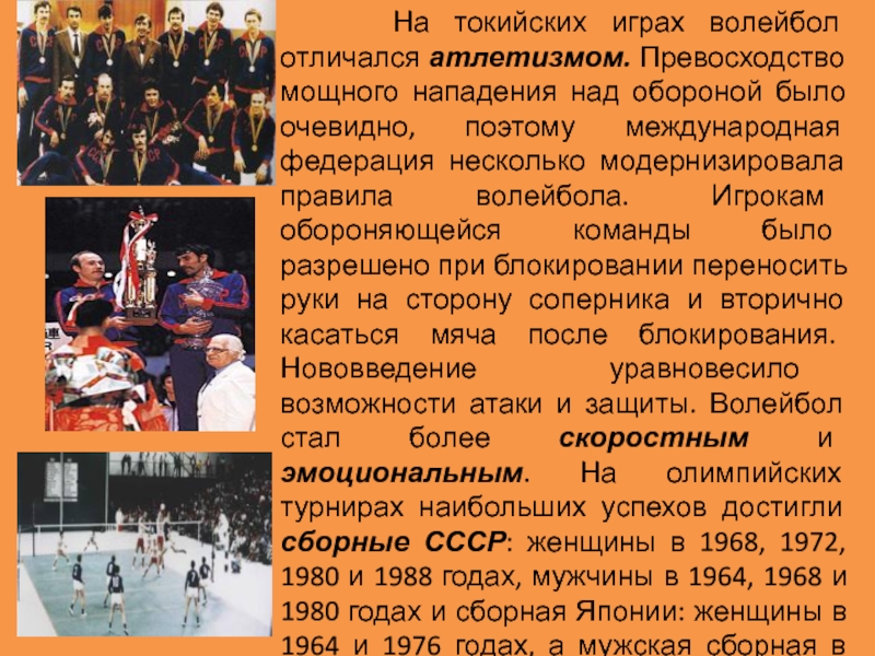 модернизировала правила волейбола. Игрокам обороняющейся команды было разрешено при блокировании переносить руки на сторону соперника и вторично касаться мяча после блокирования. Нововведение уравновесило возможности атаки и защиты. Волейбол стал более скоростным и эмоциональным. На олимпийских турнирах наибольших успехов достигли сборные СССР: женщины в 1968, 1972, 1980 и 1988 годах, мужчины в 1964, 1968 и 1980 годах и сборная Японии: женщины в 1964 и 1976 годах, а мужская сборная в 1972 году.
