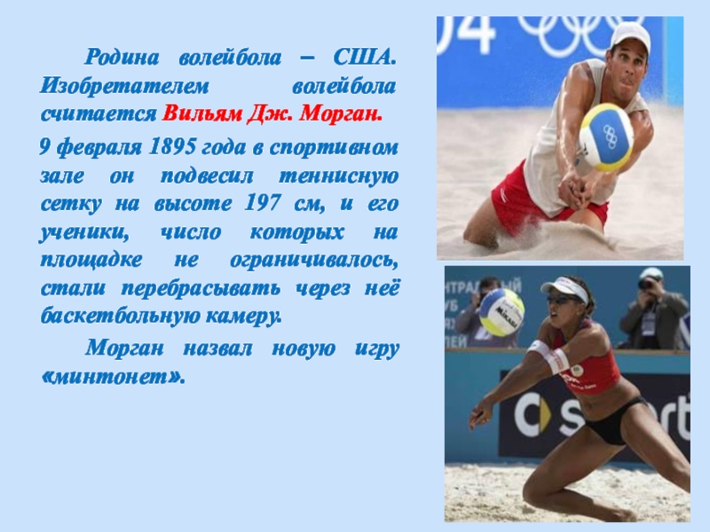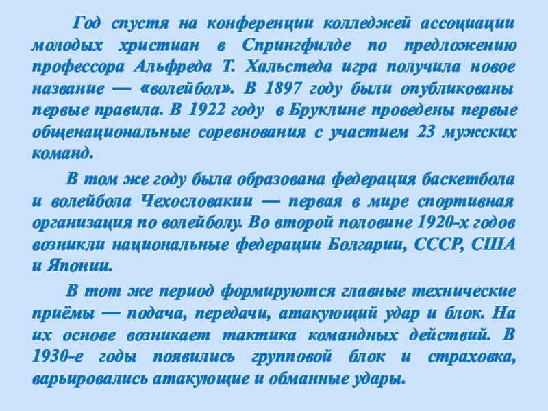 получила новое название — «волейбол». В 1897 году были опубликованы первые правила. В 1922 году в Бруклине проведены первые общенациональные соревнования с участием 23 мужских команд.