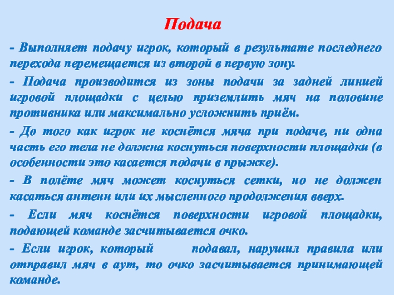 - До того как игрок не коснётся мяча при подаче, ни одна часть его тела не должна коснуться поверхности площадки (в особенности это касается подачи в прыжке).