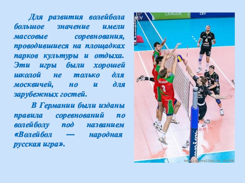 Слайд 13 Для развития волейбола большое значение имели массовые соревнования,