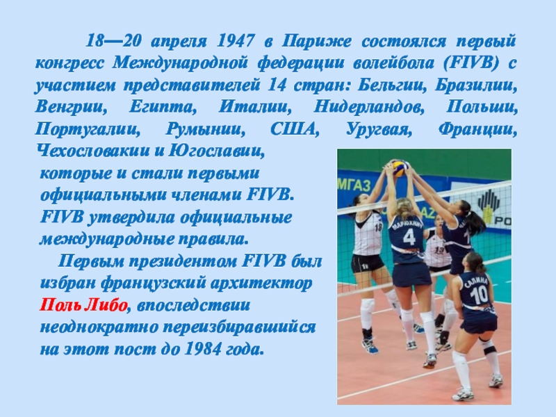 в Париже состоялся первый конгресс Международной федерации волейбола (FIVB) с
