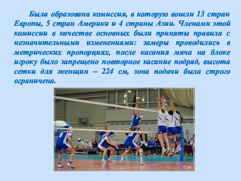 Членами этой комиссии в качестве основных были приняты правила с незначительными изменениями: замеры проводились в метрических пропорциях, после касания мяча на блоке игроку было запрещено повторное касание подряд, высота сетки для женщин – 224 см, зона подачи была строго ограничена.