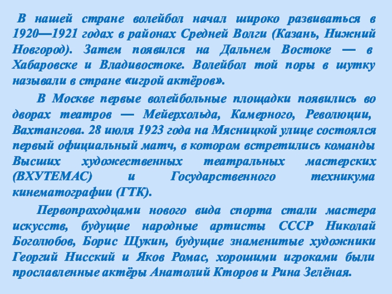 В Москве первые волейбольные площадки появились во дворах театров — Мейерхольда, Камерного, Революции, Вахтангова. 28 июля 1923 года на Мясницкой улице состоялся первый официальный матч, в котором встретились команды Высших художественных театральных мастерских (ВХУТЕМАС) и Государственного техникума кинематографии (ГТК).