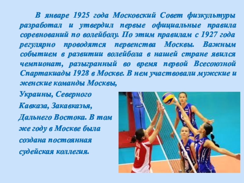 правилам с 1927 года регулярно проводятся первенства Москвы. Важным событием в развитии волейбола в нашей стране явился чемпионат, разыгранный во время первой Всесоюзной Спартакиады 1928 в Москве. В нем участвовали мужские и женские команды Москвы,