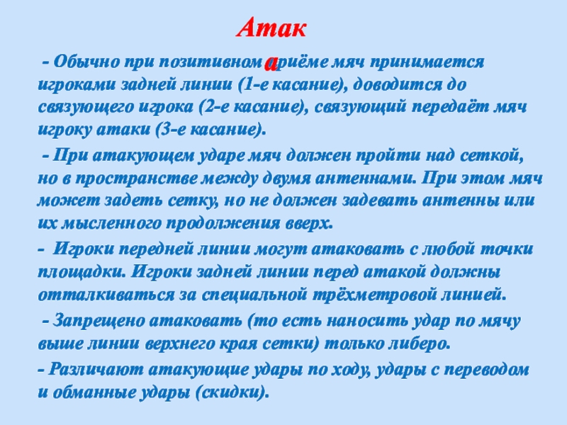 - При атакующем ударе мяч должен пройти над сеткой, но в пространстве между двумя антеннами. При этом мяч может задеть сетку, но не должен задевать антенны или их мысленного продолжения вверх.