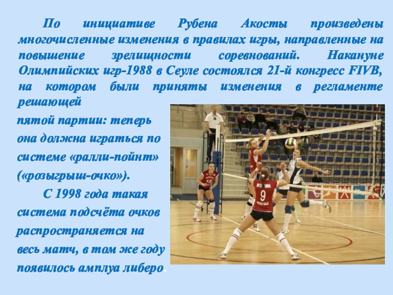 Олимпийских игр-1988 в Сеуле состоялся 21-й конгресс FIVB, на котором были приняты изменения в регламенте решающей