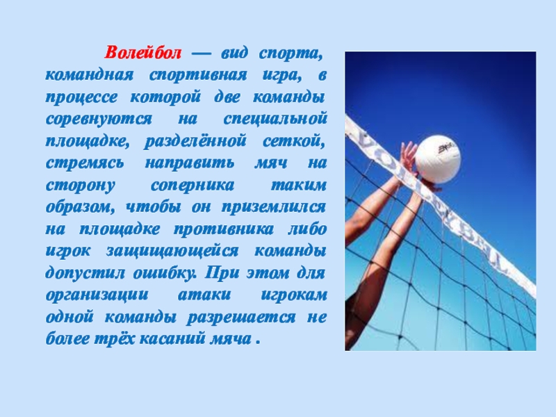на специальной площадке, разделённой сеткой, стремясь направить мяч на сторону соперника таким образом, чтобы он приземлился на площадке противника либо игрок защищающейся команды допустил ошибку. При этом для организации атаки игрокам одной команды разрешается не более трёх касаний мяча .