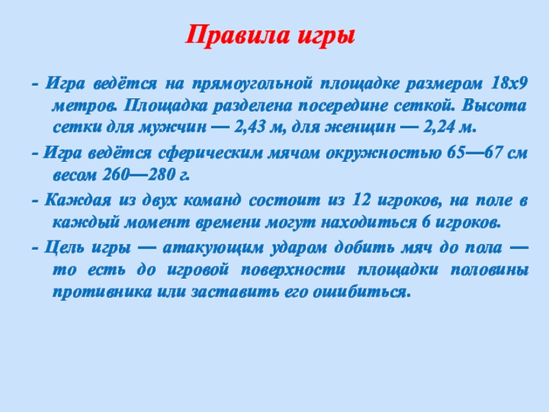 - Игра ведётся на прямоугольной площадке размером 18х9 метров.