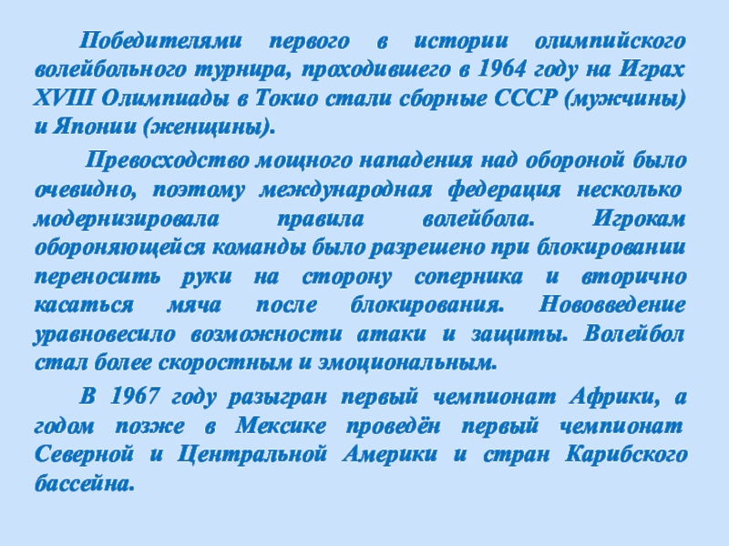 Превосходство мощного нападения над обороной было очевидно, поэтому международная федерация несколько модернизировала правила волейбола. Игрокам обороняющейся команды было разрешено при блокировании переносить руки на сторону соперника и вторично касаться мяча после блокирования. Нововведение уравновесило возможности атаки и защиты. Волейбол стал более скоростным и эмоциональным.