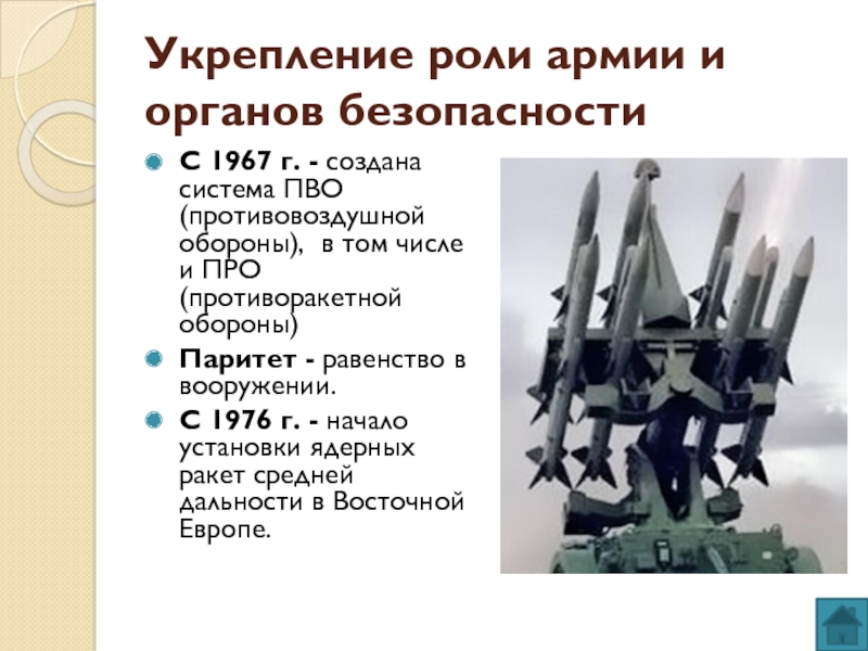 Укрепление роли армии и органов безопасностиС 1967 г. - создана система ПВО (противовоздушной обороны), в том числе