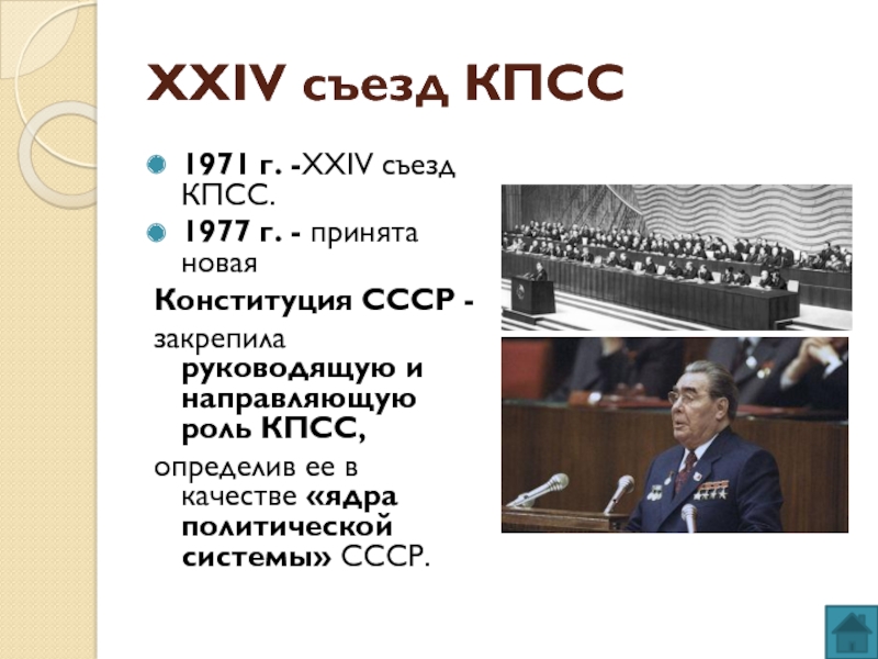 XXIV съезд КПСС1971 г. -XXIV съезд КПСС.1977 г. - принята новаяКонституция СССР - закрепила руководящую и направляющую