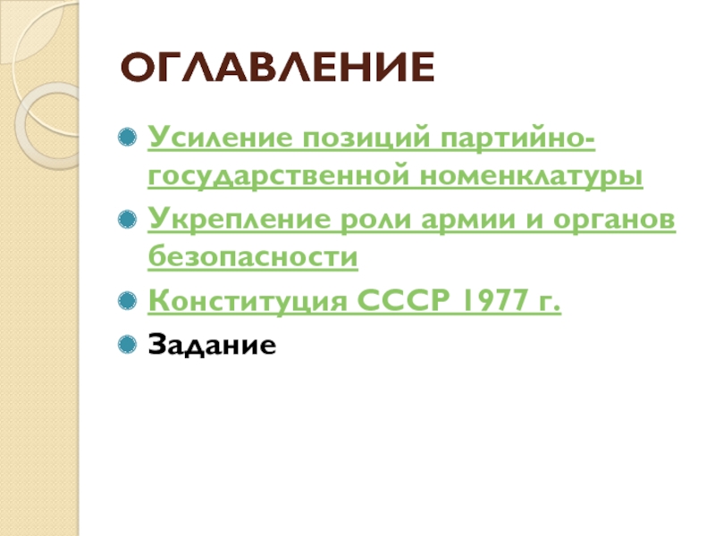 ОГЛАВЛЕНИЕУсиление позиций партийно-государственной номенклатурыУкрепление роли армии и органов безопасностиКонституция СССР 1977 г.Задание