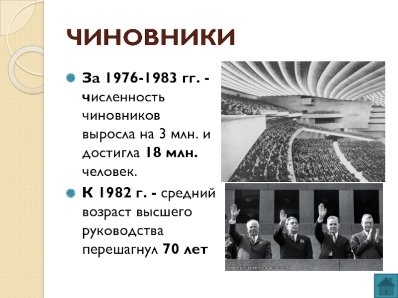 ЧИНОВНИКИЗа 1976-1983 гг. - численность чиновников выросла на 3 млн. и достигла 18 млн. человек.К 1982 г.
