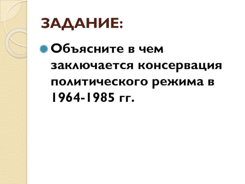 ЗАДАНИЕ:Объясните в чем заключается консервация политического режима в 1964-1985 гг.