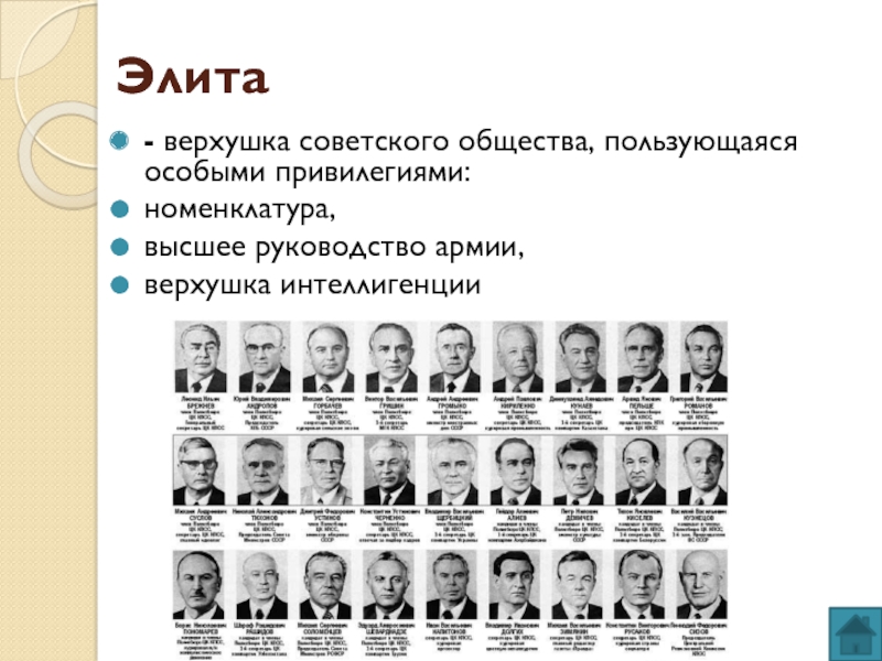 Элита- верхушка советского общества, пользующаяся особыми привилегиями: номенклатура, высшее руководство армии, верхушка интеллигенции