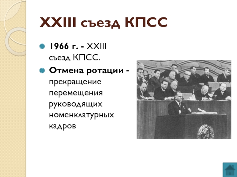 XXIII съезд КПСС1966 г. - XXIII съезд КПСС.Отмена ротации - прекращение перемещения руководящих номенклатурных кадров