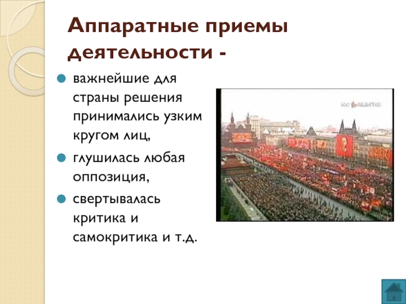 Аппаратные приемы деятельности - важнейшие для страны решения принимались узким кругом лиц, глушилась любая оппозиция, свертывалась критика