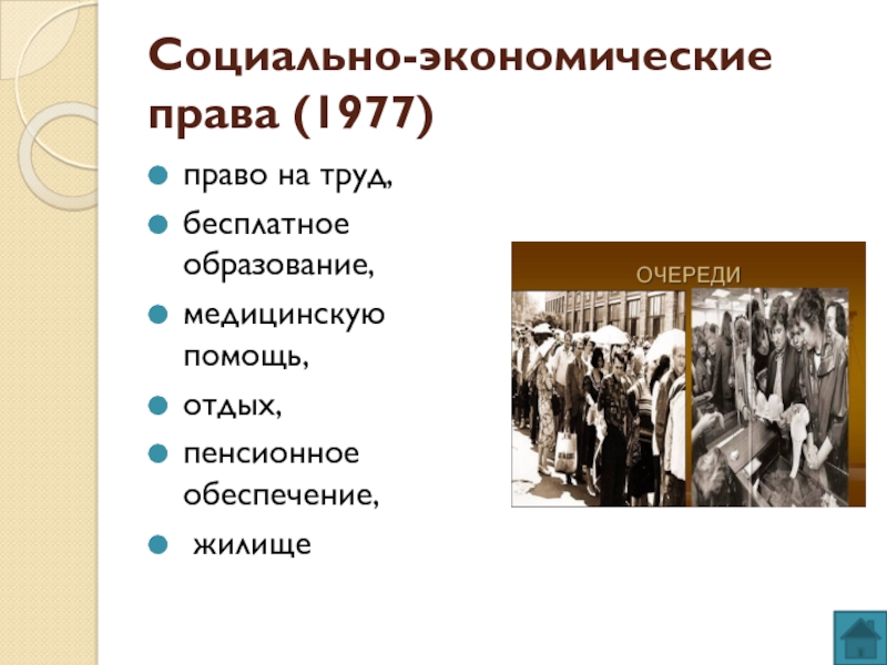 Социально-экономические права (1977)право на труд, бесплатное образование, медицинскую помощь,отдых, пенсионное обеспечение, жилище