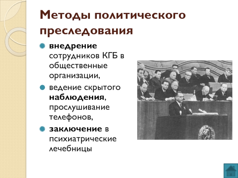 Методы политического преследованиявнедрение сотрудников КГБ в общественные организации, ведение скрытого наблюдения, прослушивание телефонов, заключение в психиатрические лечебницы