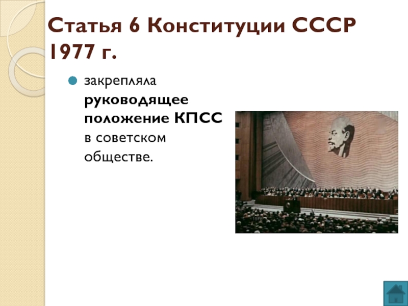 Статья 6 Конституции СССР 1977 г.закрепляла руководящее положение КПСС в советском обществе.