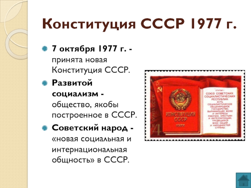 Конституция СССР 1977 г.7 октября 1977 г. - принята новая Конституция СССР.Развитой социализм - общество, якобы построенное