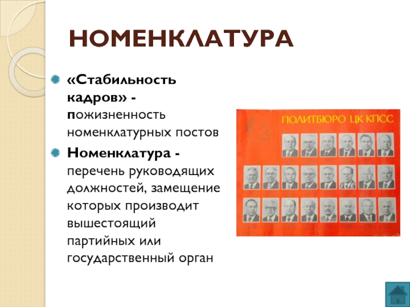 НОМЕНКЛАТУРА«Стабильность кадров» - пожизненность номенклатурных постовНоменклатура - перечень руководящих должностей, замещение которых производит вышестоящий партийных или государственный