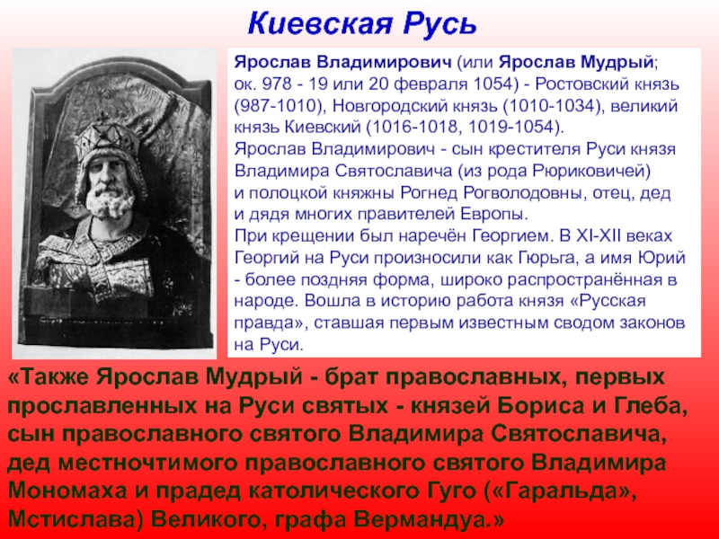 «Также Ярослав Мудрый - брат православных, первых прославленных на Руси святых - князей Бориса и Глеба, сын православного святого Владимира Святославича, дед местночтимого православного святого Владимира Мономаха и прадед католического Гуго («Гаральда», Мстислава) Великого, графа Вермандуа.»