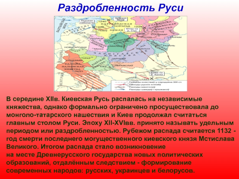 «14 апреля 1132 г. Мстислав умер, передав трон своему брату Ярополку. 1132 г. общепризнанно считается датой окончательного распада Киевской Руси: с одной стороны, сыновья Мстислава (Изяслав, Ростислав, Всеволод) стали правителями самостоятельных княжеств и в дальнейшем выступали против своих дядьёв Мономаховичей; с другой - ни один из ближайших преемников Мстислава не обладал его военными и политическими талантами и не смог остановить дезинтеграции древнерусских земель. И хотя Ярополк славился отличным полководцем и храбрым воином, но как политик был очень слаб и не мог остановить дальнейшего распада и дробления земель на независимые от Киева княжества».