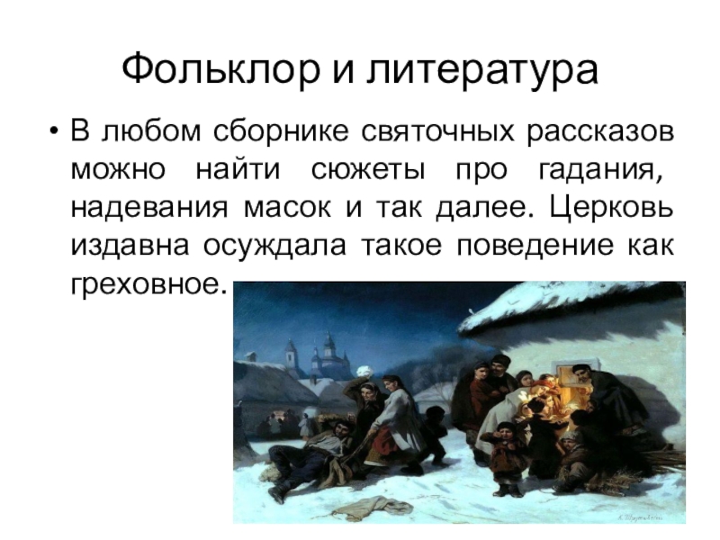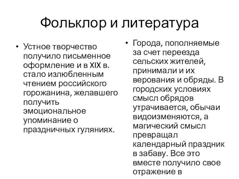 Города, пополняемые за счет переезда сельских жителей, принимали и их верования и обряды. В городских условиях смысл обрядов утрачивается, обычаи видоизменяются, а магический смысл превращал календарный праздник в забаву. Все это вместе получило свое отражение в литературе.