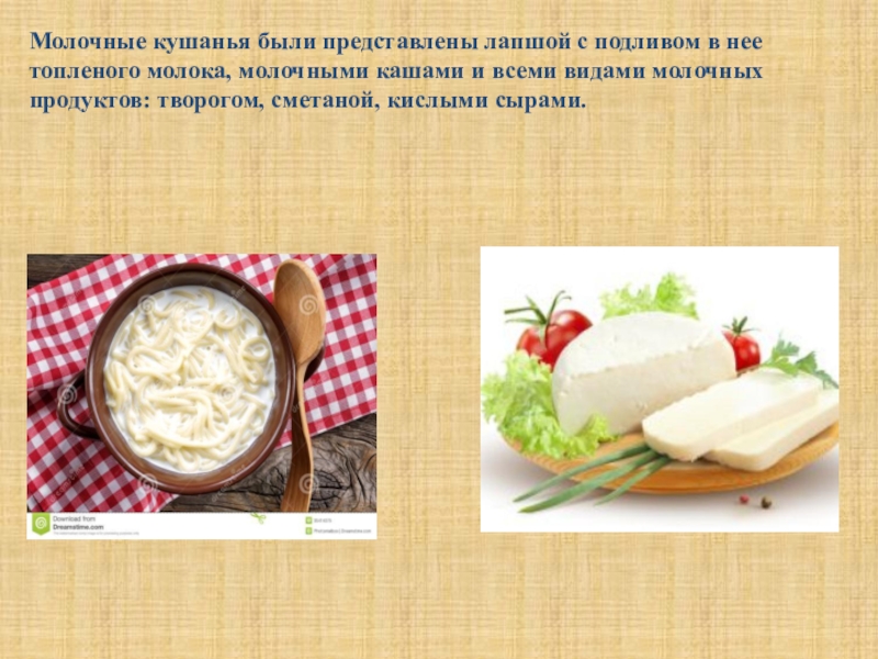Слайд 8Молочные кушанья были представлены лапшой с подливом в нее топленого