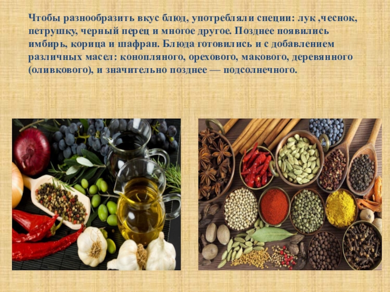 Слайд 15Чтобы разнообразить вкус блюд, употребляли специи: лук ,чеснок, петрушку, черный
