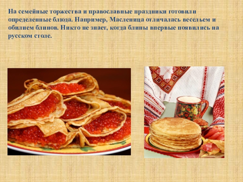 Слайд 12На семейные торжества и православные праздники готовили определенные блюда. Например,