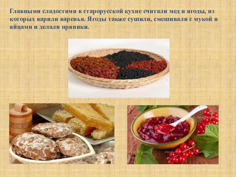 Слайд 17Главными сладостями в старорусской кухне считали мед и ягоды, из