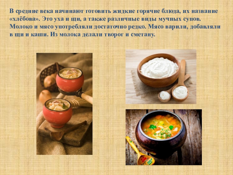 Слайд 16В средние века начинают готовить жидкие горячие блюда, их название