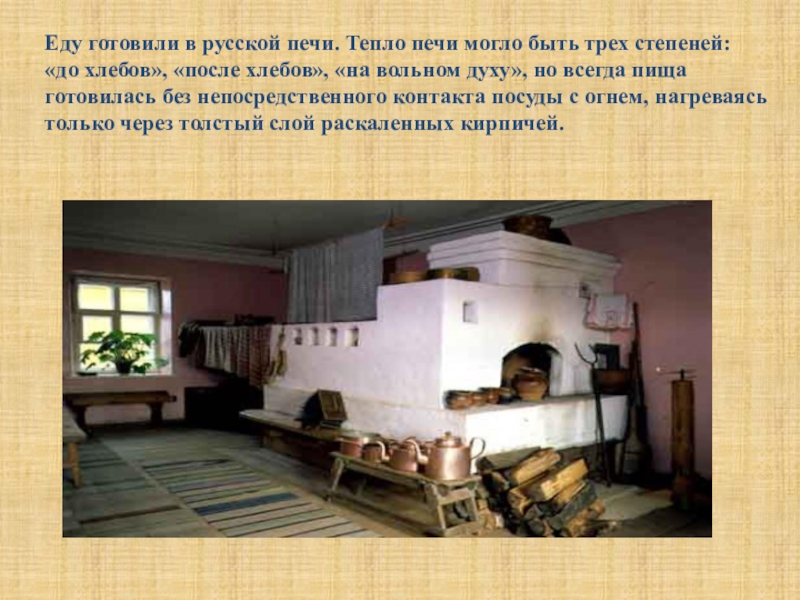 Слайд 11Еду готовили в русской печи. Тепло печи могло быть трех