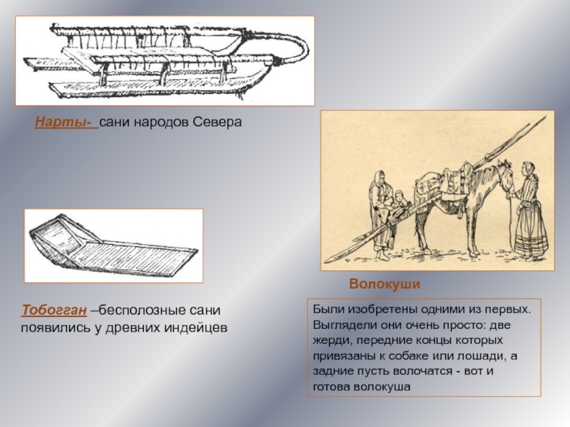 Слайд 19Старинные сани имели вид лодки с краями, загнутыми спереди и