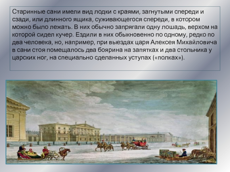 лежать. В них обычно запрягали одну лошадь, верхом на которой сидел кучер. Ездили в них обыкновенно по одному, редко по два человека, но, например, при выездах царя Алексея Михайловича в сани стоя помещалось два боярина на запятках и два стольника у царских ног, на специально сделанных уступах («полках»).