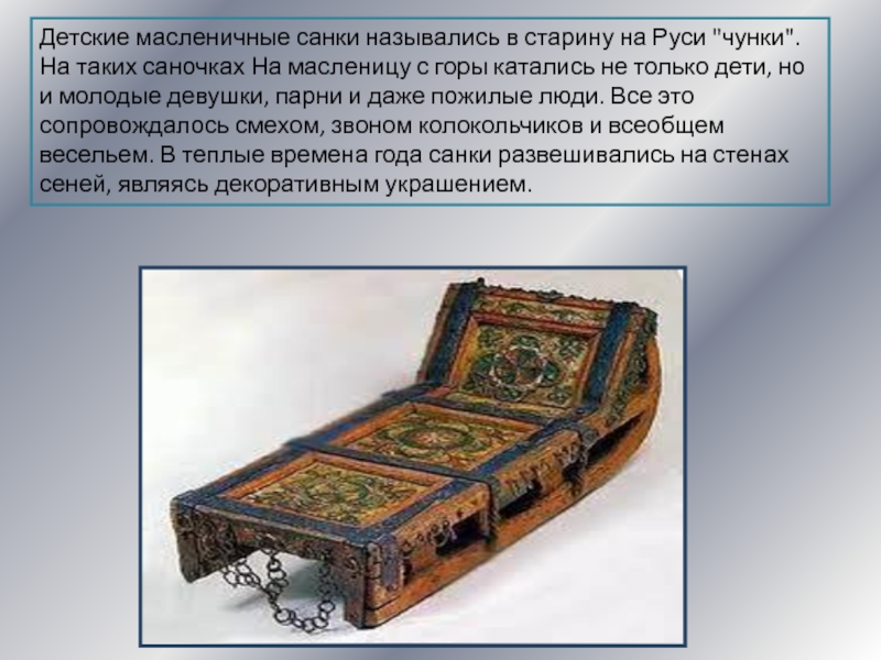 Слайд 24Детские масленичные санки назывались в старину на Руси "чунки". На